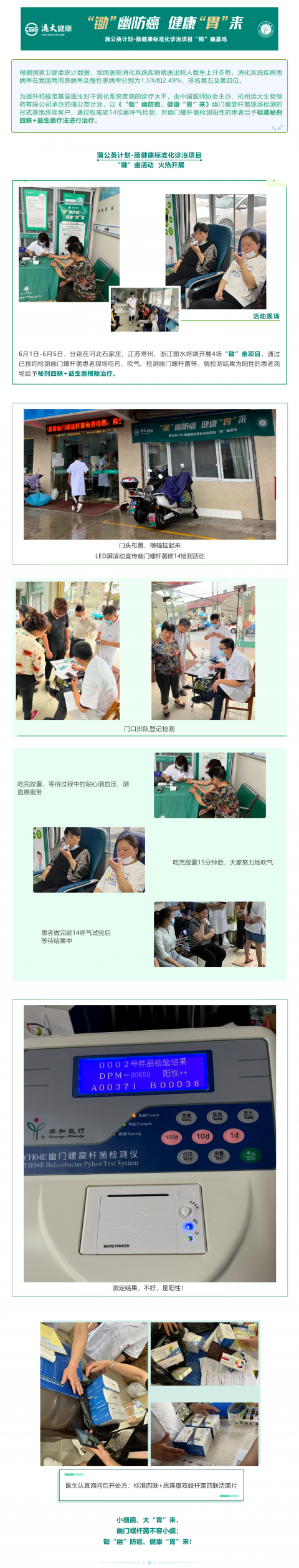 為提升和規范基層醫生對于消化系統疾病的診療水平,由中國醫師協會主辦、杭州遠大生物制藥有限公司承辦的蒲公英計劃,以《“鋤”幽防癌,健康“胃”來》幽門螺旋桿菌現場檢測的形式落地終端客戶,通過權威碳14儀器呼氣檢測,對幽門螺桿菌檢測陽性的患者給予標準秘劑四聯+益生菌療法進行治療。